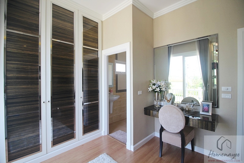 มุมแต่งตัววางตู้เสื้อผ้าใบใหญ่ได้ พื้นที่ที่ติดกับประตูห้องจะสามารถวางโต๊ะเครื่องแป้งได้ค่ะ