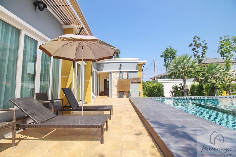 พื้นที่นั่งเล่นข้างสระ ตรงนี้ก็จะมีห้องน้ำและส่วนอาบน้ำของ Clubhouse