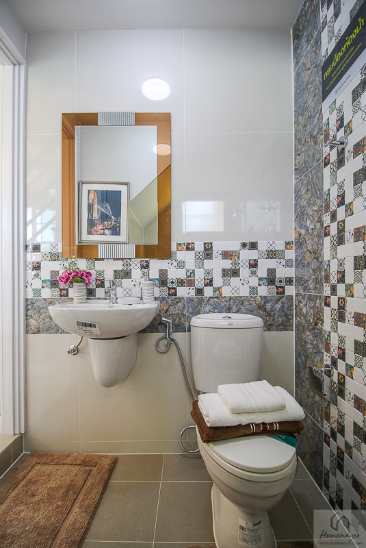 ห้องน้ำเป็นแบบ Powder room คือไม่มีส่วนอาบน้ำแต่มีโถสุขภัณฑ์และอ่างล้างมือมาให้ พื้นห้องน้ำจะปูด้วยกระเบื้องเซรามิกขนาด 30 x 30 ซม. ผนังกรุด้วยกระเบื้องกระเบื้องเซรามิคขนาด 60 x 60 ซม.จากพื้นจรดฝ้าเพดาน พร้อมมีกระเบื้องตกแต่งผนังห้องน้ำเพิ่มเติม สุขภัณฑ์ในห้องน้ำเป็นของ American Standard เหนืออ่างล้างมือติดกระจกเงามาให้