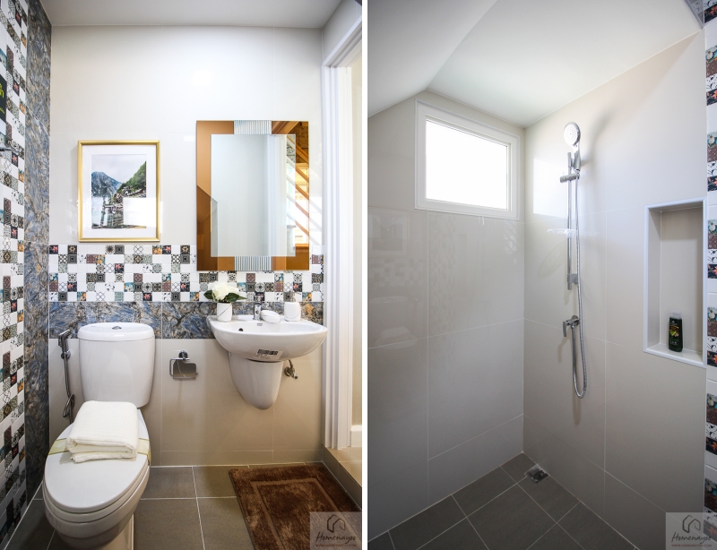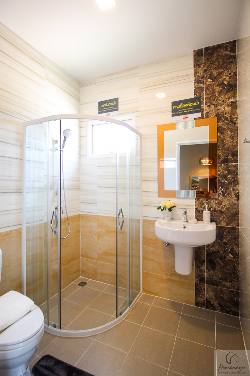 สุขภัณฑ์ในห้องน้ำของ American Standard พร้อมติดตั้งฉากกั้นอาบน้ำที่ชั้นสองให้พร้อมใช้งาน พื้นที่หลังบ้านออกแบบมาไว้รองรับการต่อเติมโดยพื้นลงเสาเข็มเท่าตัวบ้าน และเทคอนกรีตมาให้เลยไม่ต้องกลัวพื้นทรุด พร้อมก่อกำแพงสูงมาด้วย ลูกบ้านแค่ทำหลังคาเพิ่มกับตกแต่งภายในเท่านั้น ช่วยประหยัดงบไปได้เยอะเลยครับ