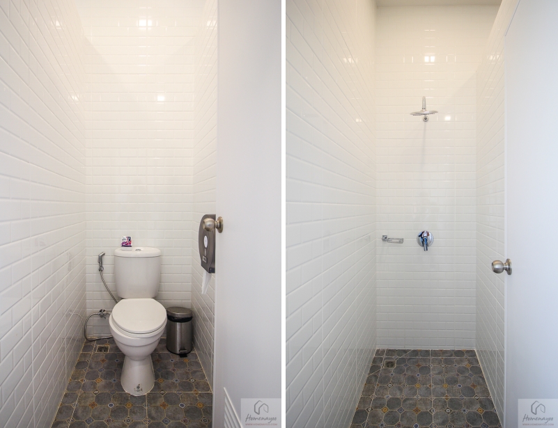 ตรงโถงบันไดมีห้องน้ำ 1 ห้อง ภายในห้องน้ำแบ่งส่วนเปียกส่วนแห้งพร้อมติดตั้งฉากกั้นอาบน้ำมาให้เรียบร้อย