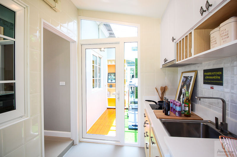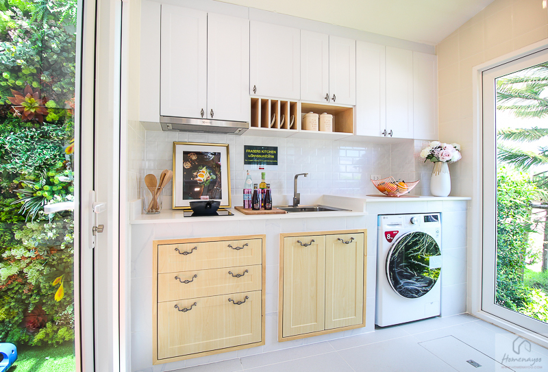 พื้นที่หลังบ้านของจริงจะได้เป็นพื้นที่โล่งไม่มีหลังคา แต่พื้นจะเทคอนกรีตขัดเรียบพร้อมลงเสาเข็มเท่าตัวบ้านไม่ต้องกลัวพื้นทรุด และกำแพงจะก่อผนังสูง พร้อมเดินรางน้ำฝนมาให้ทุกหลังเลย เราทำแค่หลังคาบ้าน และจัดวางชุดครัวได้ตามชอบ ช่วยประหยัดงบไปได้เยอะเลย บ้านตัวอย่างทำเคาน์เตอร์ครัวมาให้ดูแบบนี้