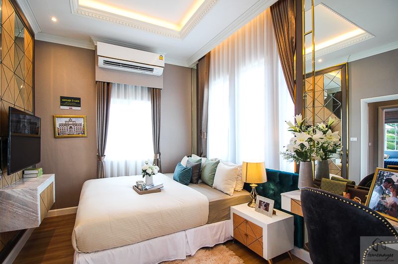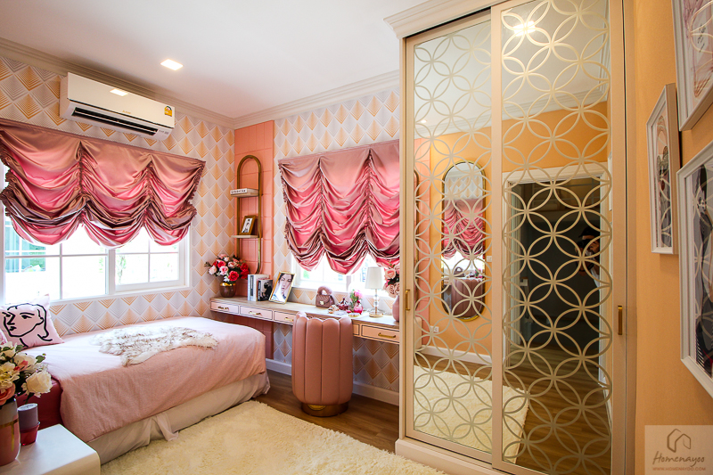 ด้านข้างเตียงมีพื้นที่ให้วางตู้เสื้อผ้าและโต๊ะเครื่องแป้งได้อีก ผนังมุมห้องซ้ายมือจะเป็นกระจกเข้ามุมพร้อมหน้าต่างบานกระทุ้ง ทำให้สามารถเปิดมุมมองเชื่อมต่อกับพื้นที่ในบ้านได้