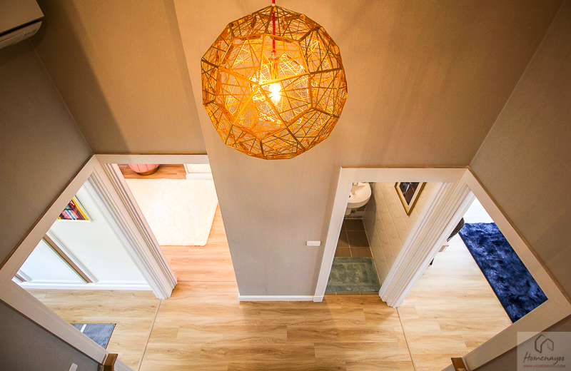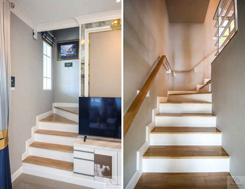 ขึ้นมาจะเจอโถงบันไดก่อน ตรงโถงบันไดจะมีชั้นลอย ซึ่งเป็นฟังก์ชันพิเศษ มีบันไดเดินขึ้นไปอีก ฝ้าเพดานตรงโถงบันไดมีความสูงอยู่ที่ประมาณ 3.7 ม. พื้นชั้น 2 จะเป็นลามิเนตหนา 8 มม.