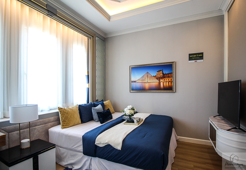 มองไปฝั่งปลายเตียง ฝั่งซ้ายวางทีวีหรือแขวนที่ผนังก็ได้ ขวามือมีพื้นที่ไว้ให้วางโต๊ะเครื่องแป้งได้
