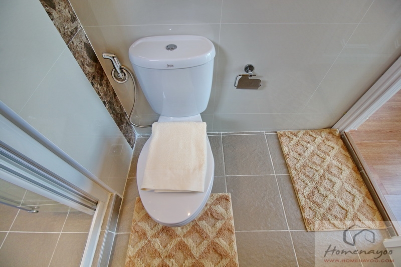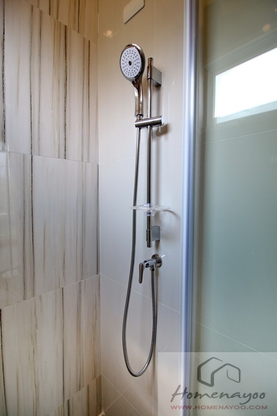 ห้องอาบน้ำติดตั้งฉากประตูบานพับ พร้อมฝักบัว และช่องแสง(สำหรับบ้านแปลงมุม)
