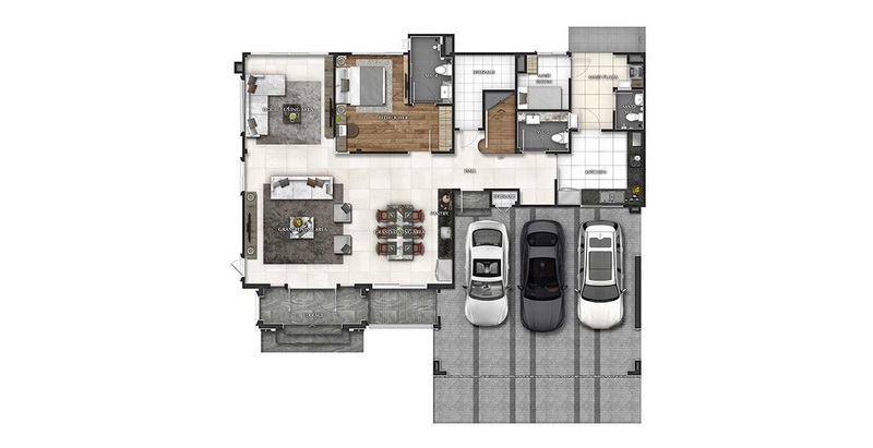 แปลนบ้านชั้น 1 บริเวณหน้าบ้านเป็นโรงจอดรถ สามารถจอดได้ 5 คัน มีประตูทางเข้าบ้านรองจากโรงจอดรถเป็นบานเลื่อนขนาดใหญ่ เชื่อมเข้าสู่โซน Dining Area และหองครัวได้ง่าย และมีทางเดินเชื่อมจากโรงจอดรถไปยังเฉลียงทางเข้าบ้านหลัก โดยออกแบบให้เป็น Ramp พื้นที่ภายในบ้านส่วนแรกเป็น Grand Living Area พื้นที่เปิดโล่งเชื่อมต่อกับ Double Living Area ที่มีประตูเชื่อมต่อกับโซน Outdoor เป็น Terrace และสระว่ายน้ำส่วนตัว, Double Volume Staircase และ Dining Area พื้นที่ส่วนนี้ให้มากว้างขวางมาก สามารถปรับเปลี่ยนการจัดวางฟังก์ชันและเฟอร์นิเจอร์ได้ตามความต้องการ