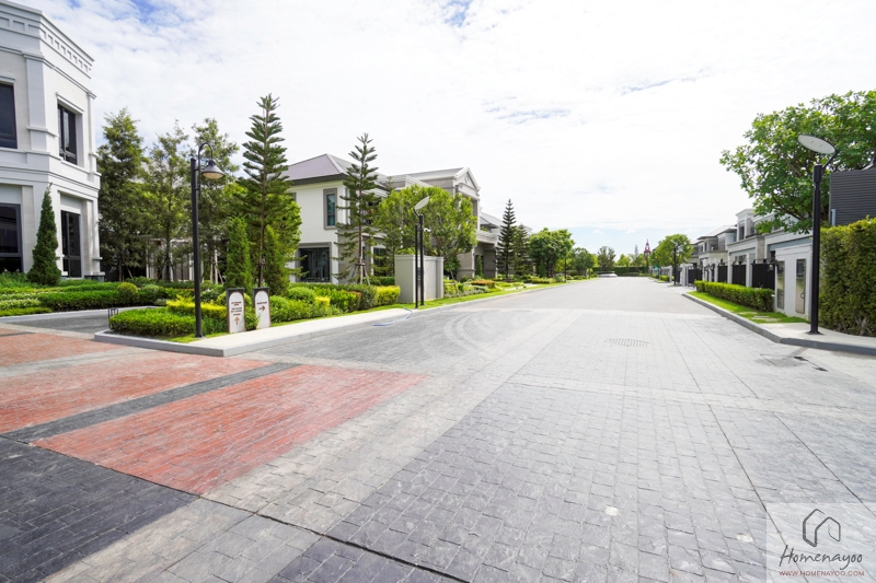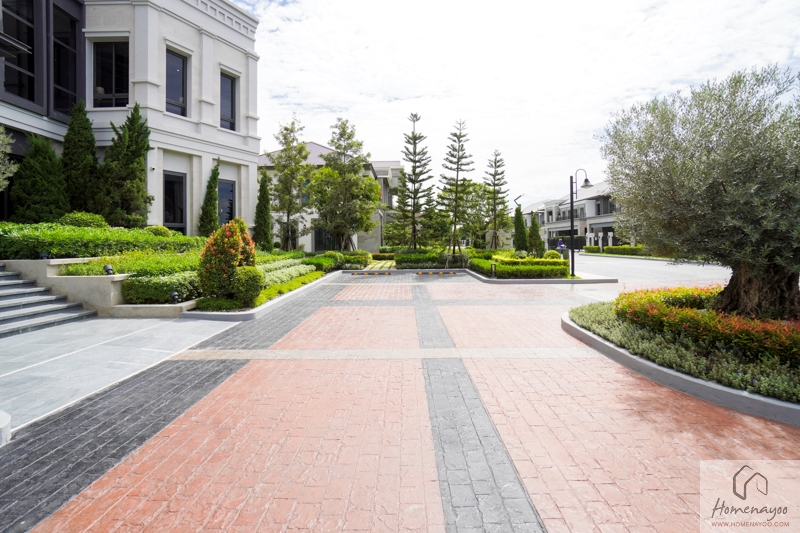 ผ่าน Main Gate เข้ามาภายในโครงการ จะมีถนนเส้นหลักตัดด้านหน้าตามขวางด้วยความกว้าง 12 ม. โซนด้านหน้าทำผิว Stamped Concrete ต่อเนื่องมากจากบริเวณ Main Gate ตรงเข้าไปด้านในเป็นผิว Asphalt สังเกตบรรยากาศภายในโครงการว่ามีความโปร่งและสะอาดตา เพราะทางโครงการเดินระบบสายไฟฟ้าลงดินทั้งหมด และยังร่มรื่นด้วยการจัดแลนด์สเคปสวย ๆ ตลอดทาง