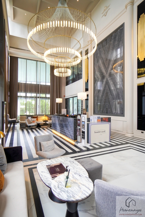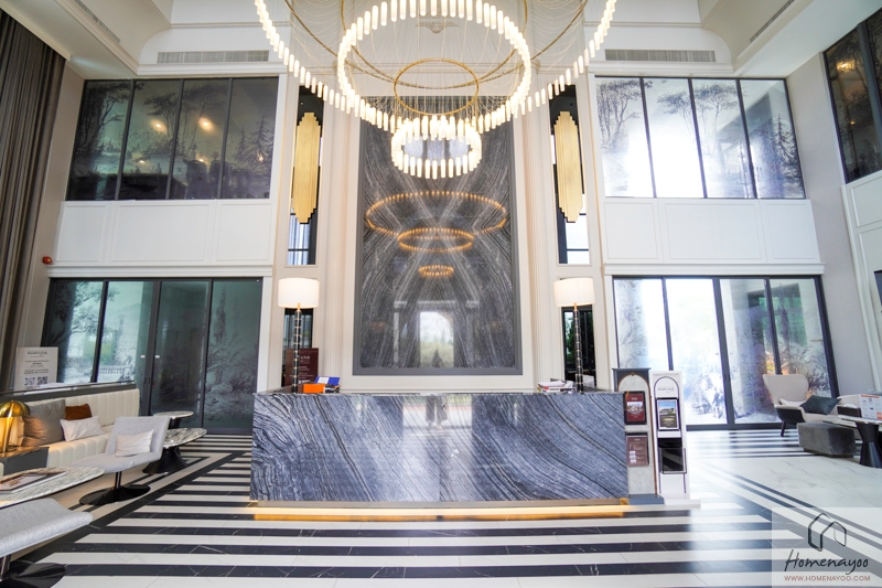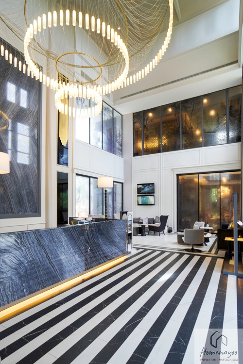 เข้ามาภายในอาคารส่วนแรกจะเป็น Lobby ขนาดใหญ่ บรรยากาศภายในมีความโปร่งโล่งด้วยฝ้าเพดานสูงแบบ Double Volume ตกแต่งอย่างสวยงามด้วยลายกระเบื้องบนพื้น ผนังหินต่อลาย Book Match และ Chandelier ขนาดใหญ่ตรงกลางโถง