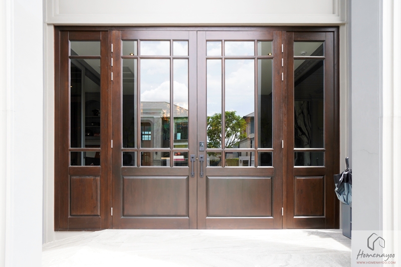 ประตูทางเข้าบ้านหลักเป็น French Door บานไม้สัก เจาะลูกฟักกระจกดูหรู มี Digital Door Lock และมือจับประตูของ Baldwin ติดตั้งมาให้