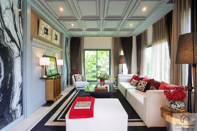 สำหรับพื้นบ้านชั้นล่างปูด้วยกระเบื้องลายหินแผ่นใหญ่จากอิตาลีขนาด 0.9 x 0.9 ม. ผนังติดวอลเปเปอร์ทั้งหลัง ไฟได้แบบ Downlight หลอด LED ประหยัดพลังงาน ส่วนฝ้าเพดานมาตรฐานสูง 3 ม. ทั้ง 2 ชั้น
