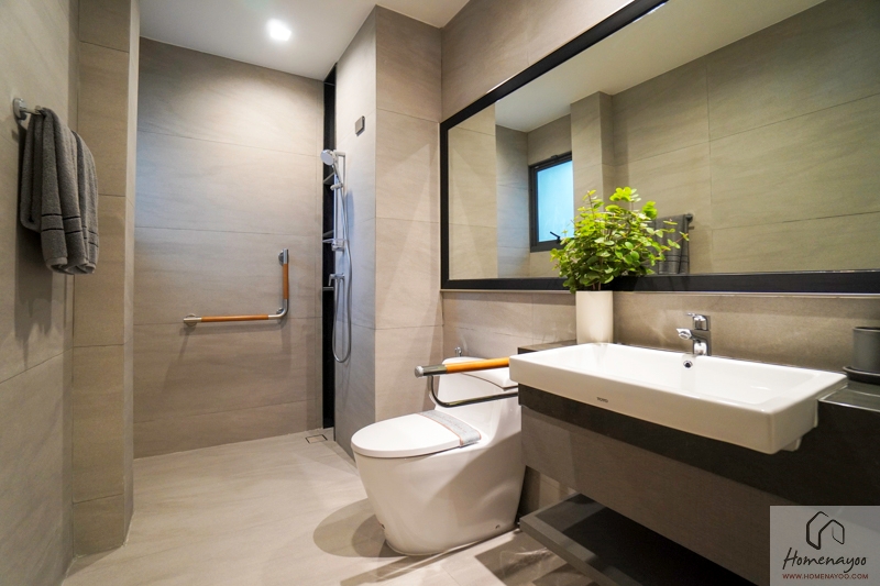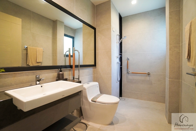 ภายในห้องน้ำเป็น Stepless Bathroom ตกแต่งพื้นและผนังด้วยกระเบื้องลายหินโทนสีเทา แยกการใช้งานส่วนเปียก-ส่วนแห้ง พร้อมสุขภัณฑ์แบรนด์ Toto ครบตามการใช้งาน พร้อมติดอุปกรณ์เสริมเพื่อการพยุงตัวตามจุดต่าง ๆ ค่ะ