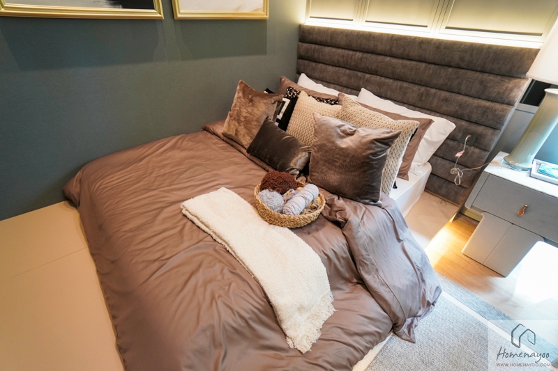บ้านตัวอย่างวางเตียงนอนขนาด 5 ฟุตและโต๊ะทำงานมากำลังลงตัวกับพื้นที่ห้องเลยค่ะ