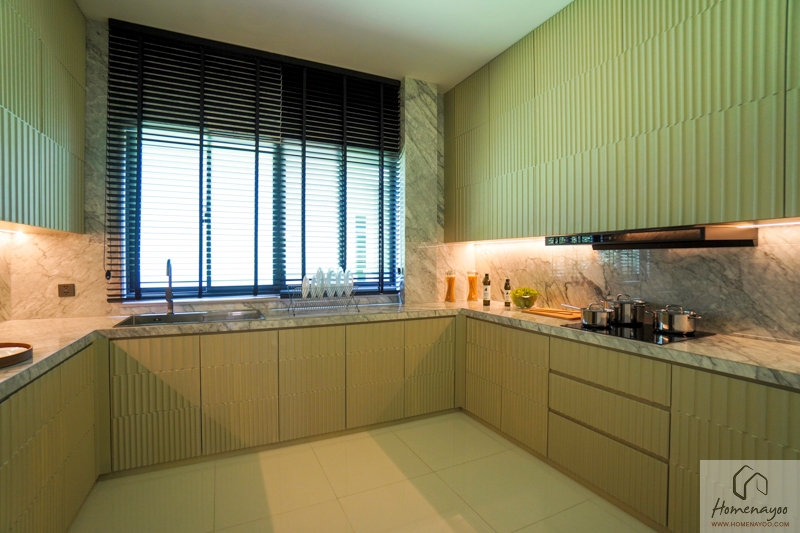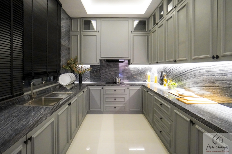 ห้องครัวไทยแยกส่วนออกมาจาก Dining Area เพื่อกันกลิ่นจากการปรุงอาหาร ภายในห้องครัวได้พื้นที่กว้าง บ้านตัวอย่างทำเป็นเคาน์เตอร์ครัวแบบตัว U ขนาดใหญ่ ใช้งานได้สะดวก บ้านมาตรฐานจะได้เป็นห้องเปล่าที่เดินระบบน้ำไว้รองรับ