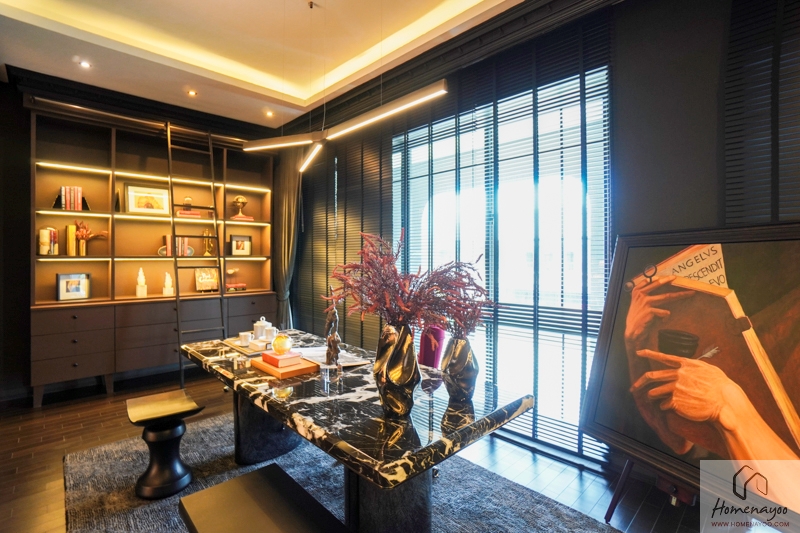 บ้านตัวอย่างตกแต่ง Family Area เป็นห้องทำงานส่วนตัว ทำผนังตกแต่งขึ้นมากั้นส่วน และทำดีเทลเป็นชั้นวางของดูสวยเข้ากับงาน Art Pieces ที่ใช้ตกแต่งในบ้าน