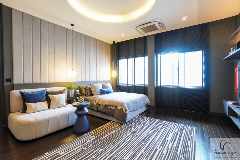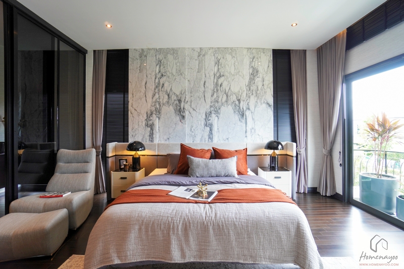 บ้านตัวอย่างวางเตียงนอนขนาด 5 ฟุตกับโต๊ะข้าง 2 ฝั่งและโซฟาสำหรับนั่งพักผ่อนได้
