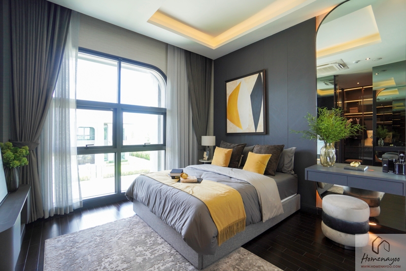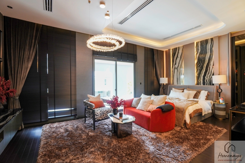 เริ่มจาก Master Bedroom สำหรับ Space ของห้องนี้จะมีความกว้างขวางกว่าห้องอื่น ๆ และยังมีฝ้าเพดานที่สูงมากเป็นพิเศษถึง 4.5 ม. ทำให้ห้องดูโปร่งสบาย จัดเฟอร์นิเจอร์ได้อย่างอิสระ และยังเพิ่ม Chandelier สวย ๆ สร้างบรรยากาศในห้องได้เป็นอย่างดี