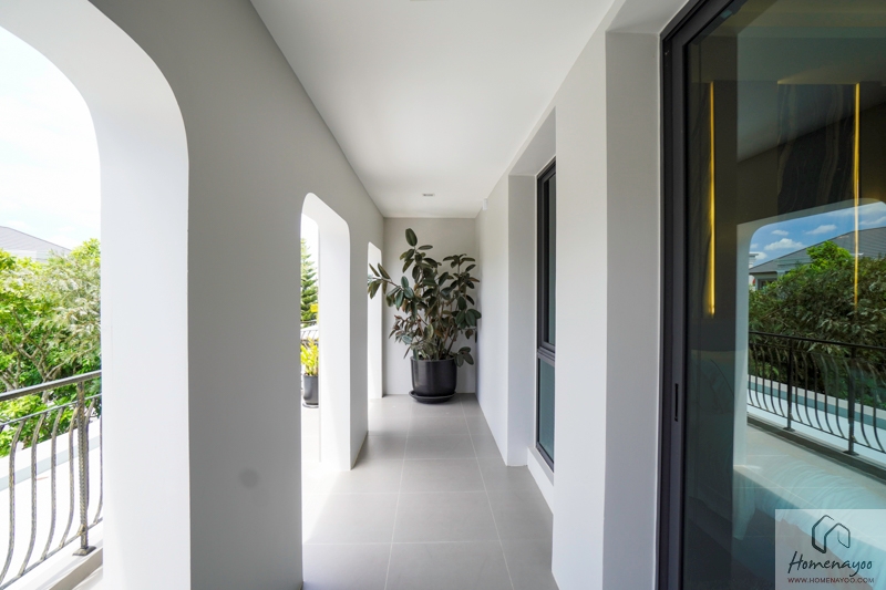 ฝั่งหน้าบ้านเราได้พื้นที่ระเบียงมาขนาดใหญ่ จัดเป็นมุมนั่งเล่นชมวิวได้เลย