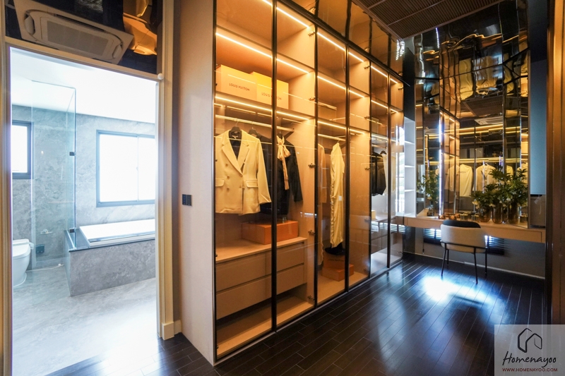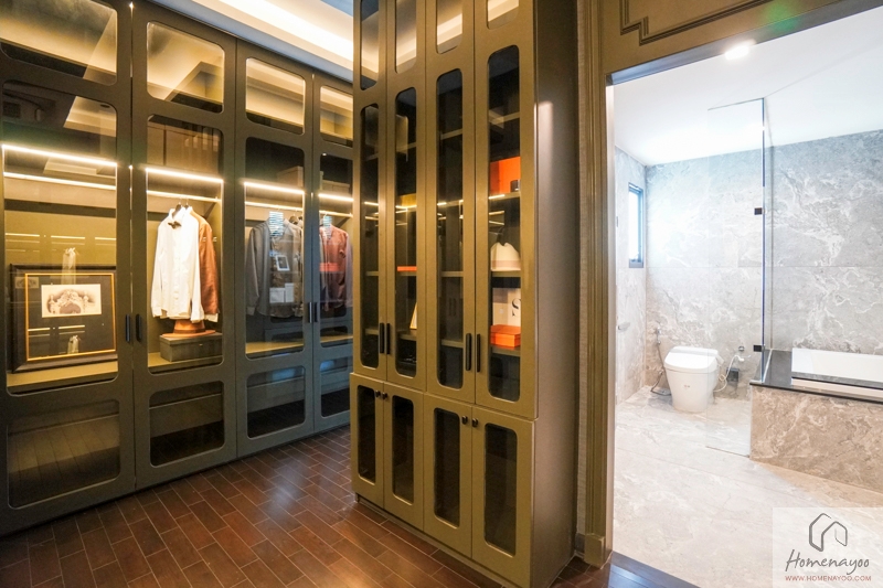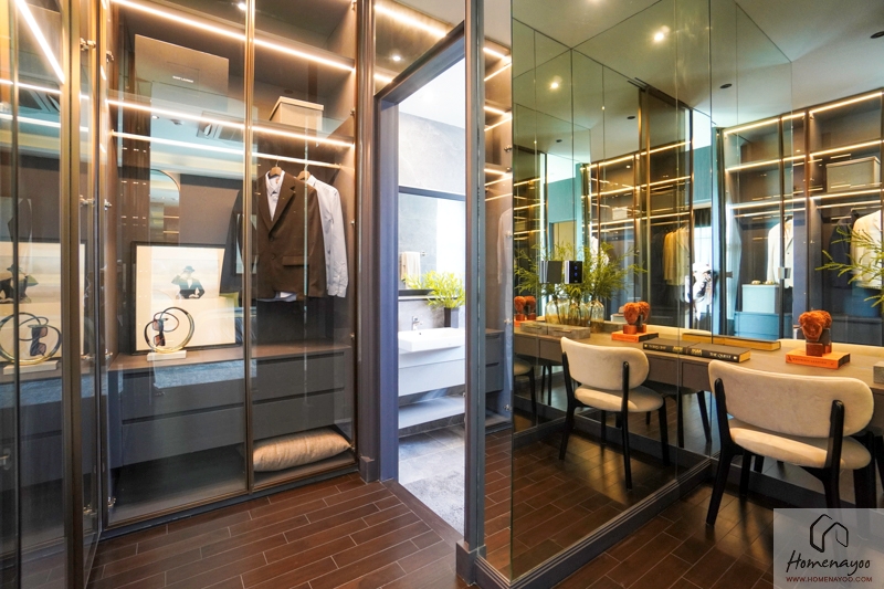 โถงด้านหน้าห้องน้ำกั้นส่วนเป็น Walk-in Closet ได้ Built-in ตู้เสื้อผ้าและโต๊ะเครื่องแป้งขนาดใหญ่ได้ลงตัว