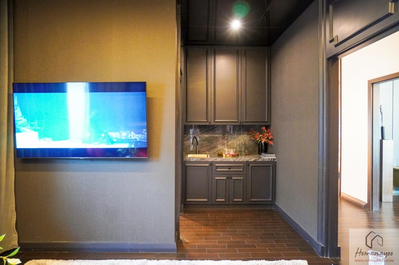 ส่วนพื้นที่โถงหน้าห้องน้ำตกแต่งเป็นแพนทรี่สำหรับเตรียมเครื่องดื่มและเก็บล้างแก้วหรือจานของว่างง่าย ๆ ได้ ถ้าใช้เป็นห้องนอนจะเป็นจุดที่ Built-in ตู้เสื้อผ้าได้ค่ะ