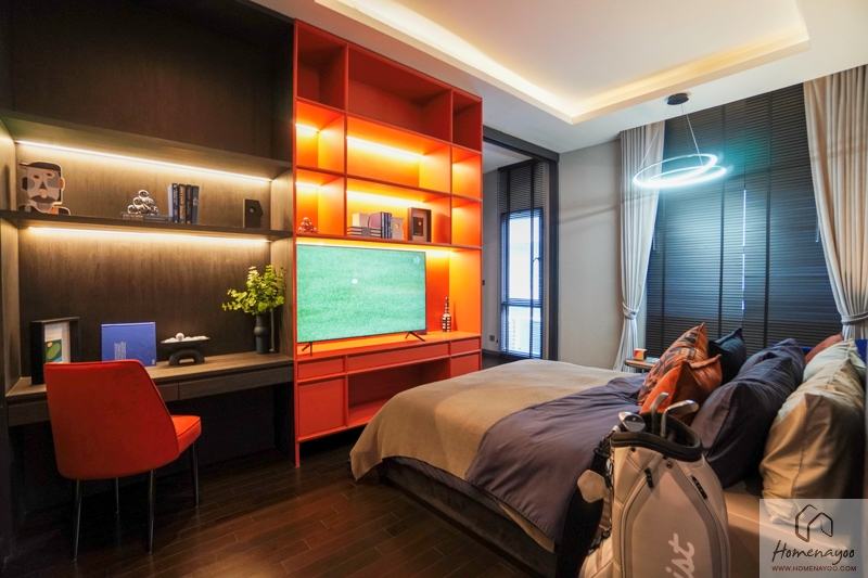 ส่วนฝั่งปลายเตียงทำเป็นชั้นวางทีวี โต๊ะทำงาน และชั้นวางของได้ และพื้นที่ด้านหน้าห้องน้ำก็เป็นจุดที่ Built-in ตู้เสื้อผ้า L Shape ได้ลงตัว
