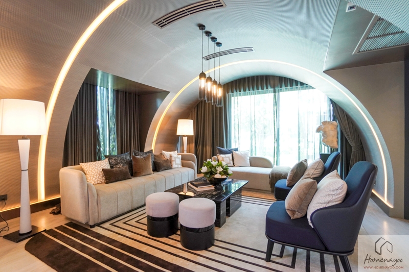 อย่างที่ทางโครงการจัดมาให้ดูจะกำลังลงตัวกับพื้นที่บ้าน รองรับได้ประมาณ 9-10 ที่นั่งแล้ว การออกแบบผนังและฝ้าเพดานเป็นทรงครึ่งวงกลมก็ทำให้ Space ดูอบอุ่นและน่าสนใจมากยิ่งขึ้น โดยหน้านี้มีประตูบานเลื่อนเดินออกไปยังพื้นที่ Terrace และสระว่ายน้ำข้างบ้านได้