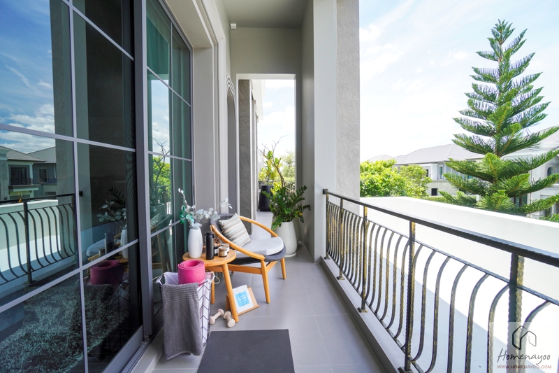 ด้านหน้าบ้านมีระเบียงส่วนตัวให้ออกไปยืนรับลมชมวิวได้ จัดพวกกระถางต้นไม้เข้าไปแบบนี้ช่วยทำให้บรรยากาศภายในห้องสดชื่นขึ้นเยอะเลย