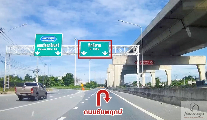 พอกลับรถใต้สะพานมาแล้ว ตรงไปเรื่อย ๆ เราจะเห็นป้ายโครงการ Grand Bangkok Boulevard แจ้งวัฒนะ-ราชพฤกษ์ อยู่ทางฝั่งซ้ายมือ