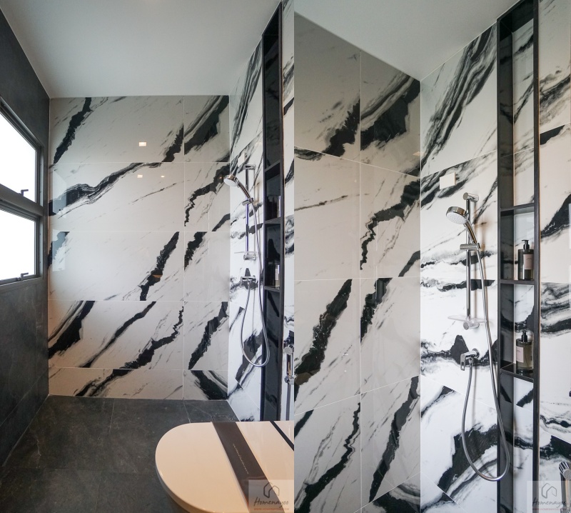 ด้านในเป็นพื้นที่ส่วนเปียก ติดตั้ง Hand Shower ปรับระดับสูงต่ำได้ พร้อมเดินงานระบบไฟฟ้าติด Junction Box รองรับการติดตั้งเครื่องทำน้ำอุ่นมาให้เรียบร้อย และมีช่องไว้สำหรับวางอุปกรณ์อาบน้ำ ในห้องน้ำมีช่องแสงเป็นบานกระทุ้งเปิดระบายอากาศได้