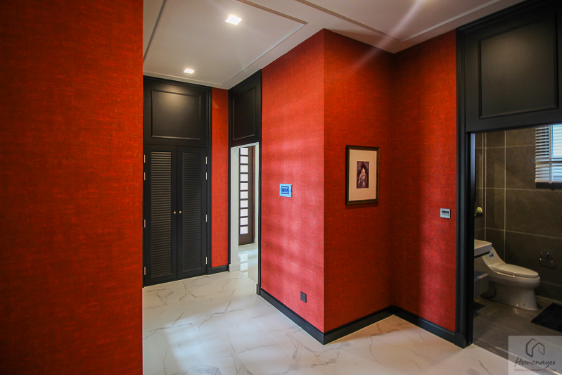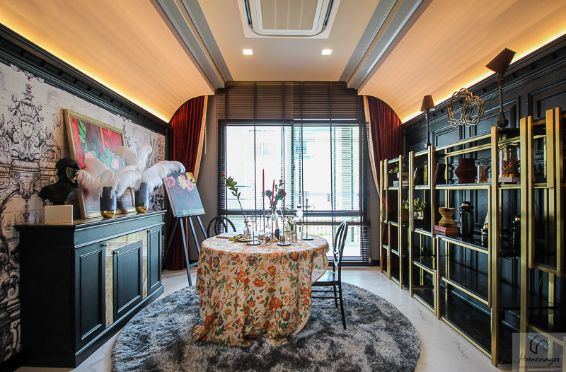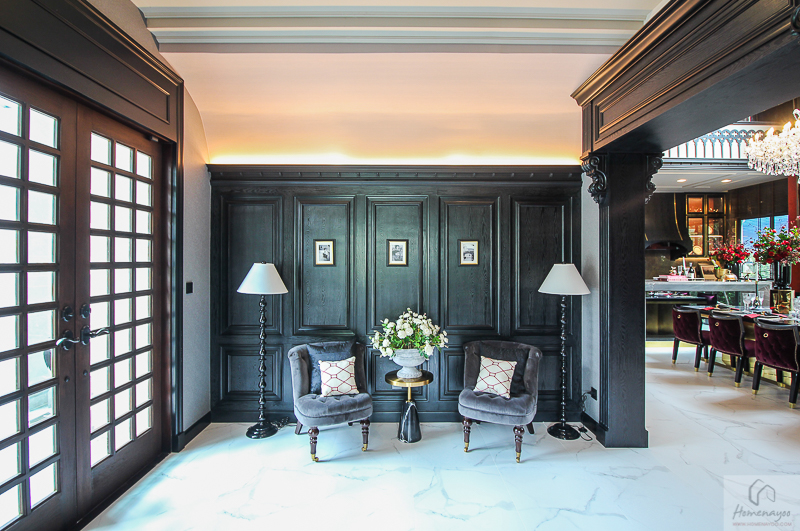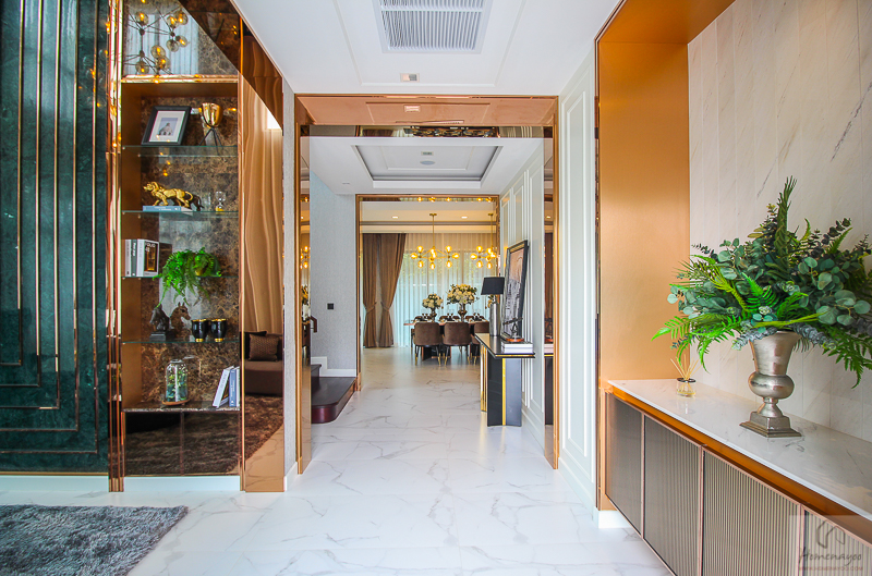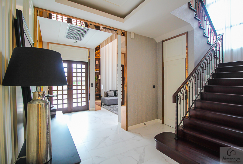 เดินเข้าบ้านมาจะเจอส่วน Foyer ก่อนจะเชื่อมไปยังโซนต่างๆในบ้าน ซ้ายมือจะเป็นห้องนั่งเล่น พื้นจะเป็นกระเบื้องลายหินสเปน ฝ้าสูง 3 ม. ผนังจะได้วอลเปเปอร์ทั้งหลัง