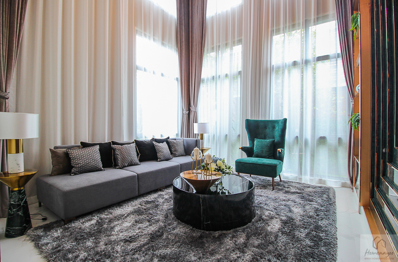 มุมห้องนั่งเล่น หรือโซนรับแขกหน้าบ้าน มีพื้นที่มาให้ประมาณ 4 x 3.9 ม. ฝ้าเป็นแบบ Double Volume สูง 7 ม.