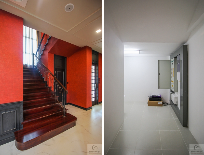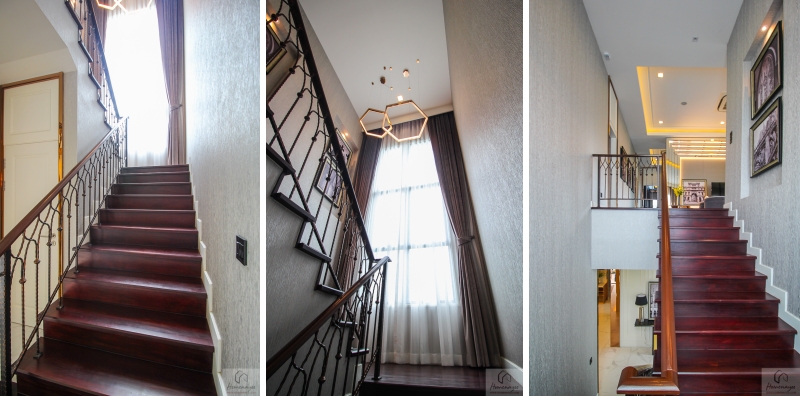 กลับเข้ามาในบ้านตรงทางขึ้นบันได บันไดบ้านจะเป็นไม้มะค่า ใต้บันไดจะมีห้องเก็บของ