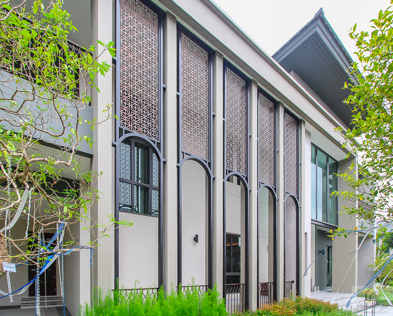 หน้าบ้านเน้นรูปรงสี่เหลี่ยม กระจกสูง มีระแนงตกแต่งฝั่งขวา ประตูบ้านเป็นบานไม้สักคู่