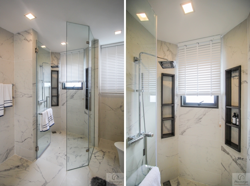 พื้นที่ส่วนเปียกติดตั้งฝักบัวมาให้ พร้อมช่องวางอุปกรณ์อาบน้ำ
