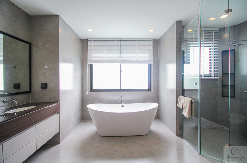 ภายในห้องน้ำแบ่งส่วนเปียกส่วนแห้ง พื้นห้องน้ำจะเรียบเสมอพื้นห้องนอน