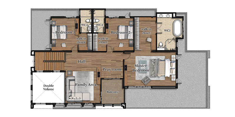 ขึ้นชั้นสองมาจะเจอโถงบันไดก่อนเชื่อมกับส่วนอเนกประสงค์ จะทำเป็นมุมห้องนั่งเล่น ดูหนัง หรือเป็นมุมทำงานก็ได้ หรือแบ่งส่วนพื้นที่ไว้สำหรับห้องพระก็ได้ ตรงนี้จะมีประตูเชื่อมออกมาตรงระเบียงหน้าบ้านได้ ถัดมาอีกจะเป็นห้อง Master Bedroom ที่ให้พื้นที่มาเยอะ กินพื้นที่ตลอดแนวข้างบ้าน มีห้องน้ำในห้องนอนพร้อมอ่างอาบน้ำ และมีพื้นที่สำหรับทำ Walk in closet ได้ ส่วนพื้นที่โซนหลังบ้านที่เหลือจะเป็นห้องนอน 2 และ 3 ภายในห้องนอนมีพื้นที่ใกล้เคียงกัน มีห้องน้ำในห้องนอน และพื้นที่สำหรับทำ Walk in closet เล็กๆได้