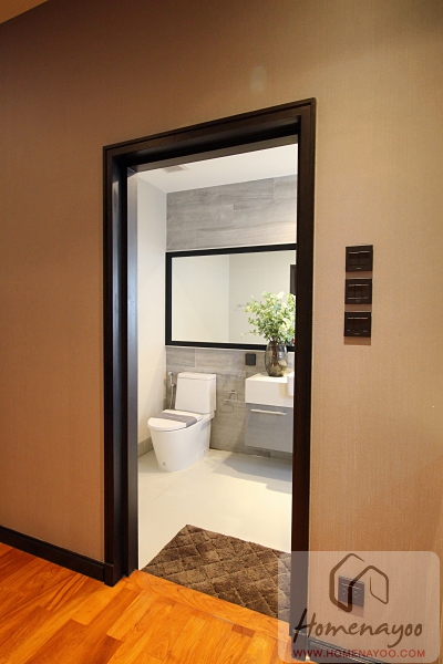 หน้าทางเข้าห้องน้ำในห้องนอน ห้องตัวอย่างทำ Built in ตู้เสื้อผ้าและโต๊ะเครื่องแป้งมาให้ดูระยะใช้งาน เข้าไปดูห้องน้ำกันต่อเลยค่ะ