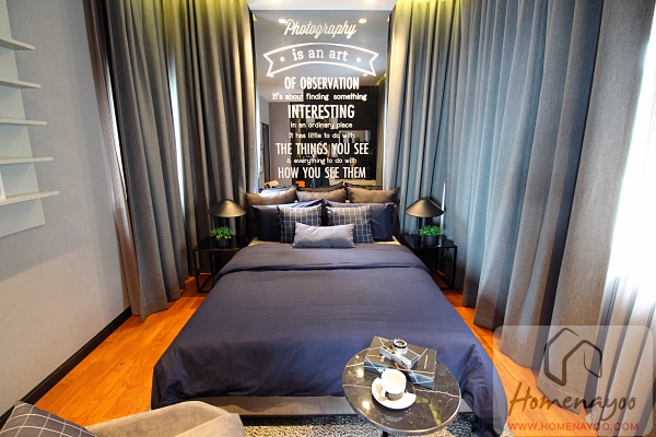 มองไปทางฝั่งปลายเตียง ห้องตัวอย่าง Built in ชั้นวางทีวีมาให้ดูเป็นไอเดีย จะเห็นว่าการติดชั้นที่ผนังห้องนี่ช่วยเพิ่มพื้นที่ใช้งานได้ดีทีเดียว