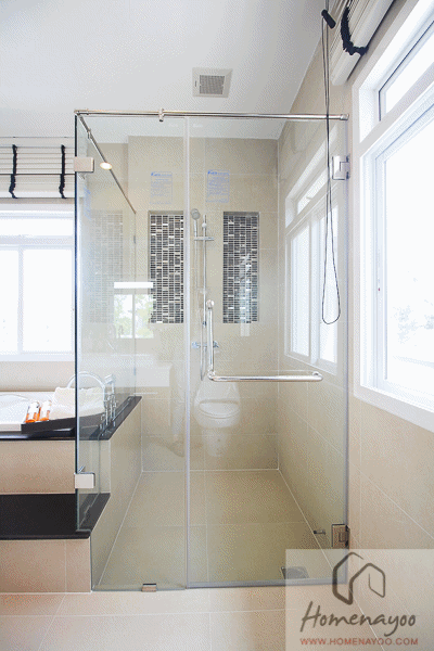 ส่วนพื้นที่อาบน้ำแบบมาตรฐาน จะได้เป็น Shower Box บานเปิดแบบผลักเข้าไปในห้องอาบน้ำ พื้นลดระดับลงไปประมาณ 3.5 ซม.