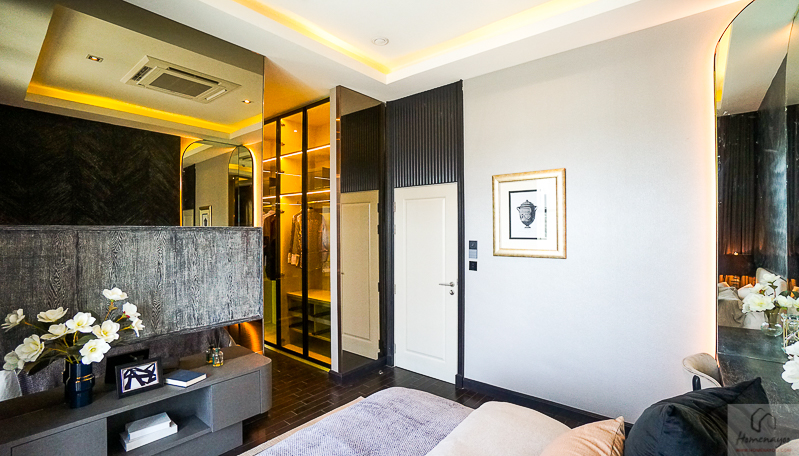 ระยะดูทีวีปลายเตียงให้มากว้าง ติดทีวีจอขนาด 55-60 นิ้วได้เลย ฝั่งด้านในเป็นห้องน้ำ และส่วน Walk-in closet
