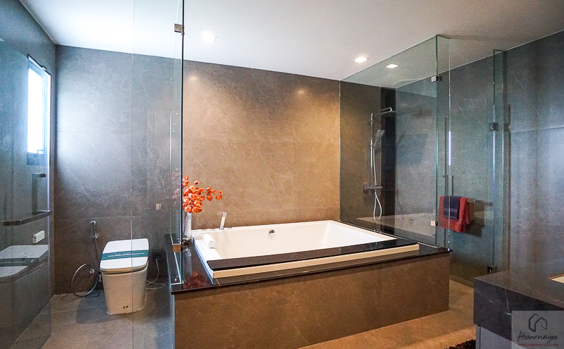 อีกฝั่งเป็นห้องน้ำ และพื้นที่ส่วนเปียกพร้อมฉากกั้นกระจกบานเปิด และตรงกลางเป็นอ่างอาบน้ำ แยกการใช้งานเป็นสัดส่วน