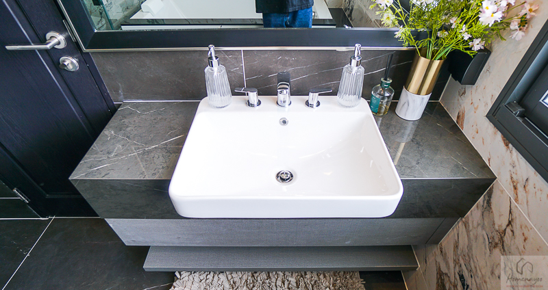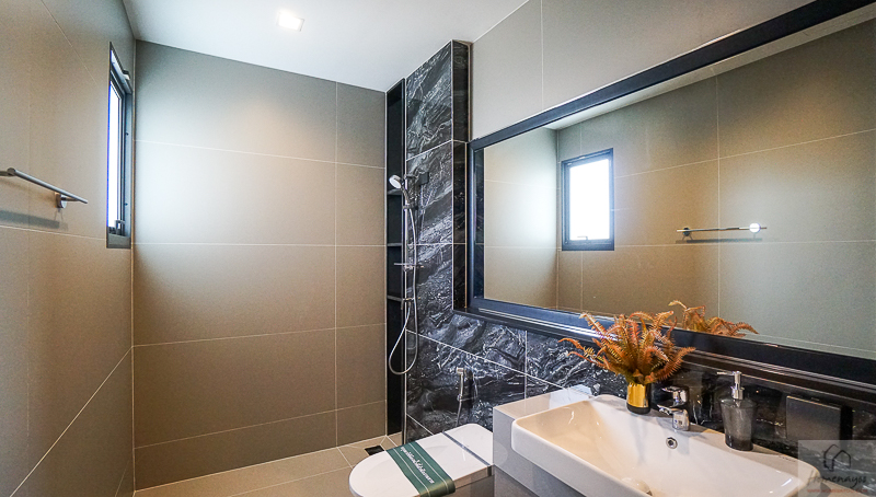 ภายในห้องน้ำแบ่งส่วนเปียกส่วนแห้งมาให้ พื้นและผนังตกแต่งด้วยกระเบื้องลายหิน ได้กระจกเงาบานใหญ่เต็มผนัง ห้องน้ำดูสว่างเนื่องจากด้านในมีช่องแสง และเป็นบานกระทุ้งให้เปิดระบายอากาศได้