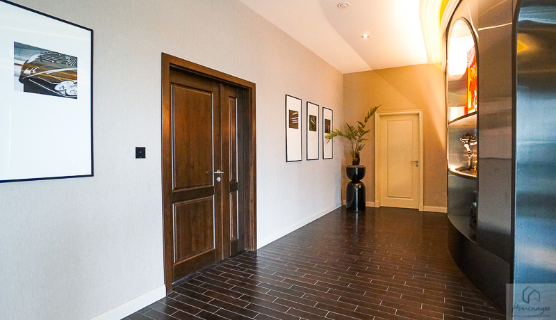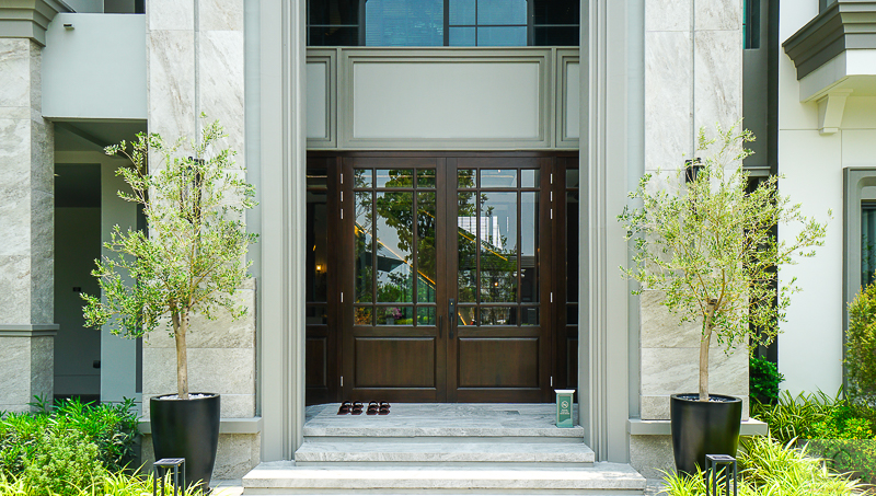 ส่วนวัสดุภายในบ้านได้ของดีมีคุณภาพ เริ่มตั้งแต่กรอบประตูหน้าบ้านเป็นไม้สัก พร้อมมือจับประตู Smart Lock ยี่ห้อ Baldwin ส่วนประตูกระจกและหน้าต่าง เป็นกระจกเขียวตัดแสงกรอบอลูมิเนียม Powder Coat พื้นชั้นล่างเป็นกระเบื้อง Cotto Italia ลายหิน ขนาด 90 x 90 ซม.