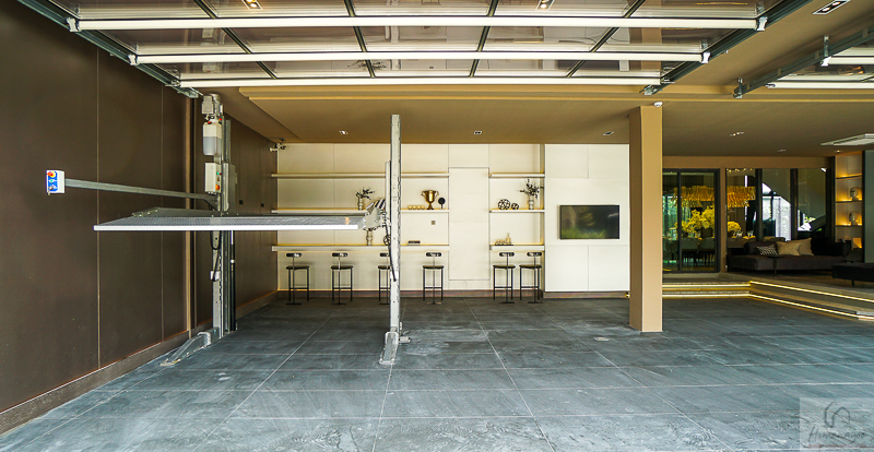 ฝั่งด้านหน้ามีประตูกระจกบานเลื่อนที่เปิดเชื่อมกับ Garage ด้านหน้า จัดปาร์ตี้แบบ Indoor ได้เลย