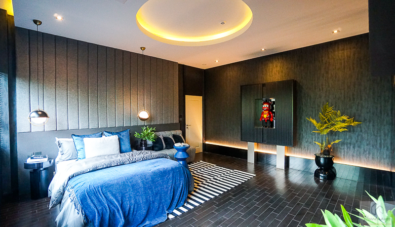 ถัดมาเป็น Double Master Bedroom (ห้องนอน 2) พื้นที่ภายในห้องขนาดใหญ่เทียบเท่า Master Bedroom ขนาดพื้นที่ยาวตั้งแต่โซนหน้าบ้านไปถึงโซนหลังบ้าน แบ่งพื้นที่วางเตียงนอน King Size โต๊ะข้างเตียง, โต๊ทำงาน, ชุดโซฟา และอาร์มแชร์ได้อีก