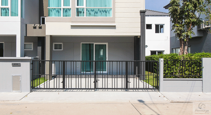ประตูรั้วหน้าบ้านเป็นแบบเลื่อน 2 ตอน ด้านหน้ามีกริ่ง Mailbox และบ้านเลขที่