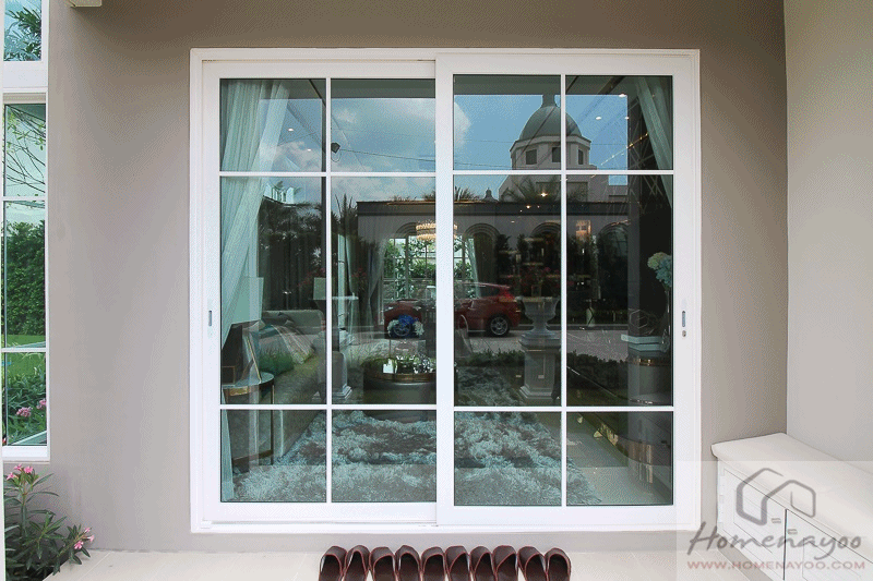 ด้านข้างห้องทานอาหารมีประตูบานเลื่อน สามารถเปิดเชื่อมต่อกับสวนข้างบ้านได้ โดยจะปูพื้นกระเบื้องมาให้เหมือนเดิม