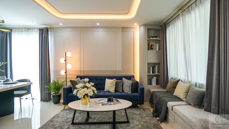 ตรงห้องนั่งเล่นจัดวางชุดโซฟาขนาดใหญ่มาให้ดู จัดวางได้ตามต้องการ