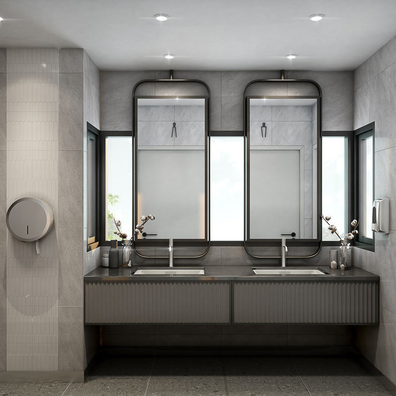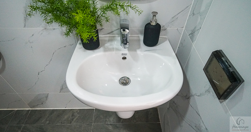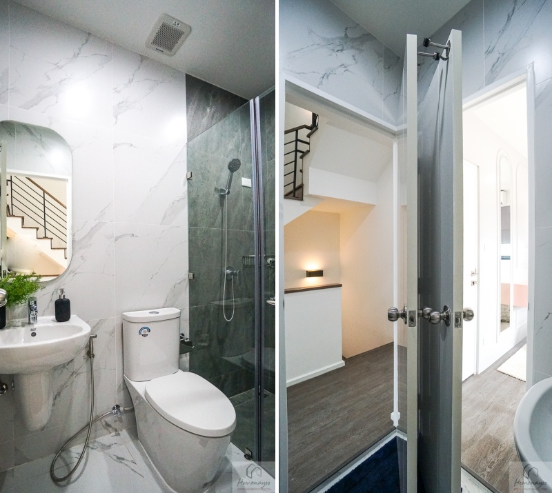 ห้องน้ำชั้นล่างฟังกชันครบทั้งส่วนเปียกส่วนแห้ง ไว้รองรับสำหรับการทำห้องนอนชั้นล่างได้ พื้นและผนังตกแต่งด้วยกระเบื้องเซรามิกโทนสีดูสว่าง ระบบระบายอากาศ ติดตั้งพัดลมดูดอากาศมาให้ 1 ตัว ช่วยให้อากาศหมุนเวียนได้ดี