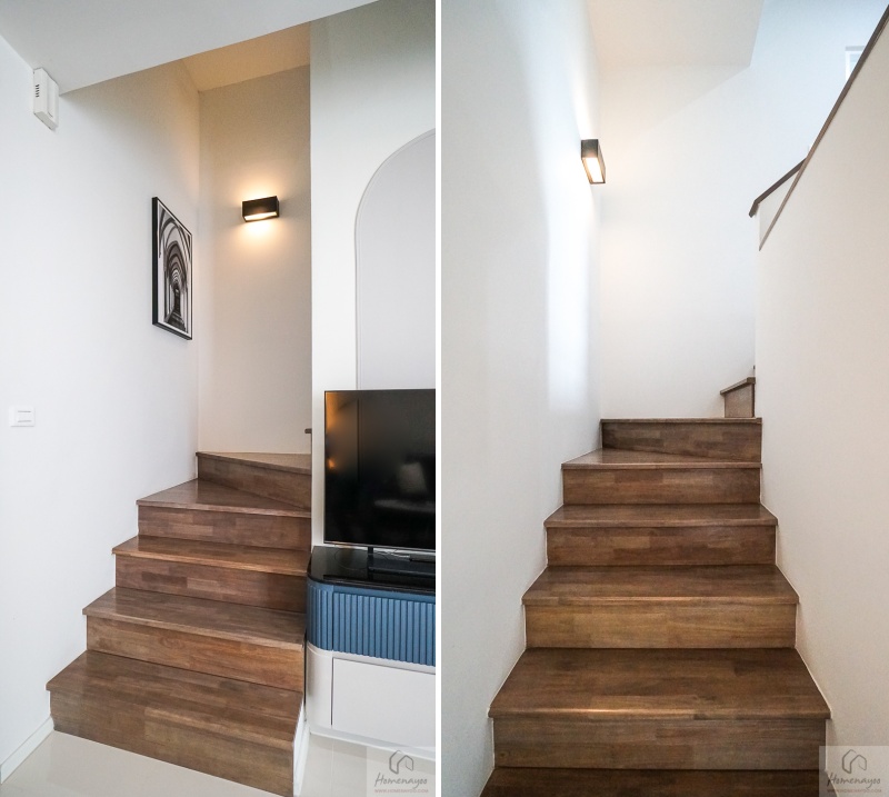 ระยะดูทีวีประมาณ 3.6 ม. ติดทีวีจอขนาด 55-60 นิ้วได้เลย ซ้ายมือเป็นบันไดขึ้นชั้น 2 ขวามือเป็นห้องน้ำ
